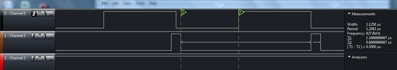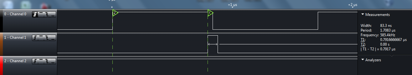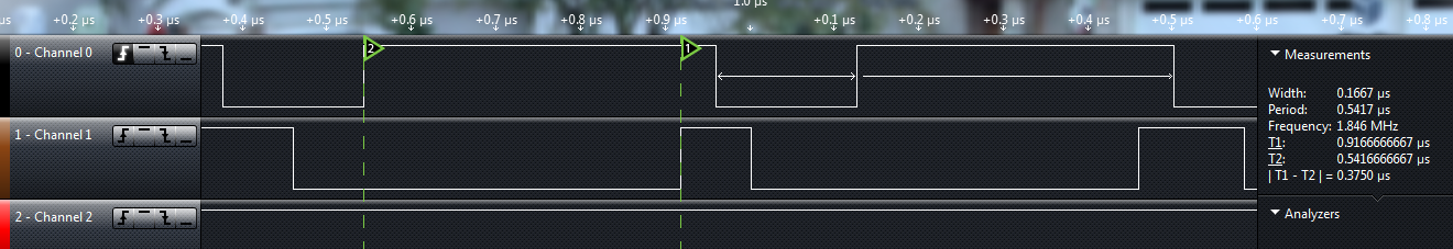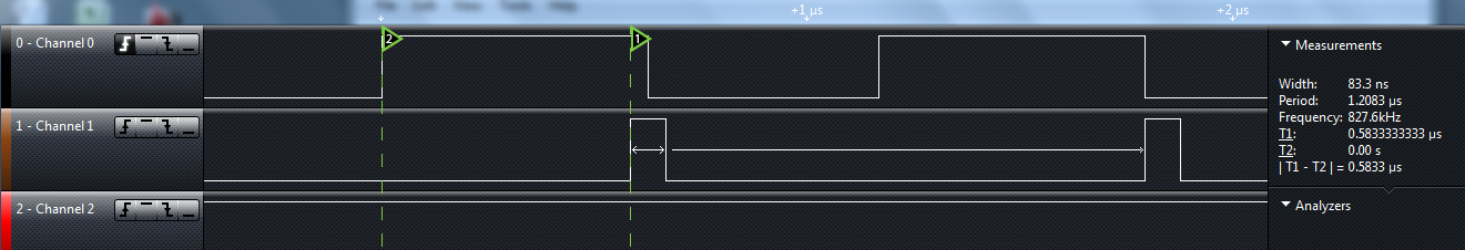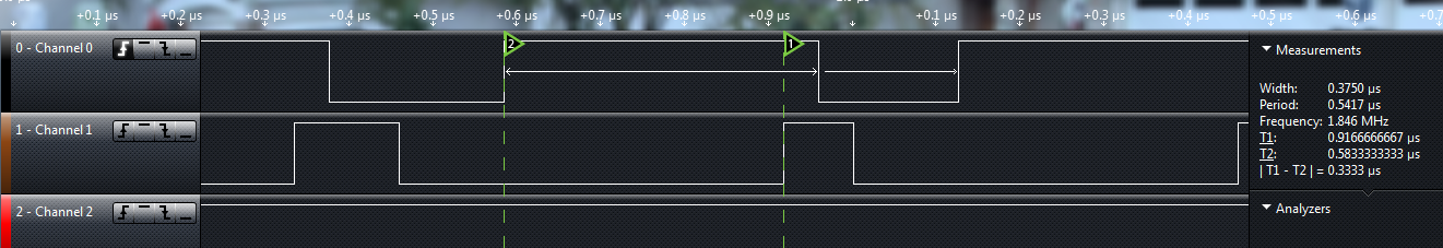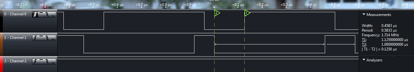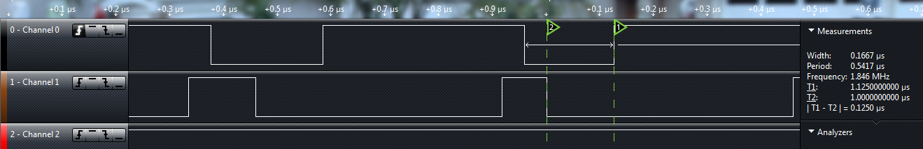 My interrupt was configured to trigger on the falling edge of the clock (Channel 0). Channel 1 is the ISR toggling ON/OFF the output line.