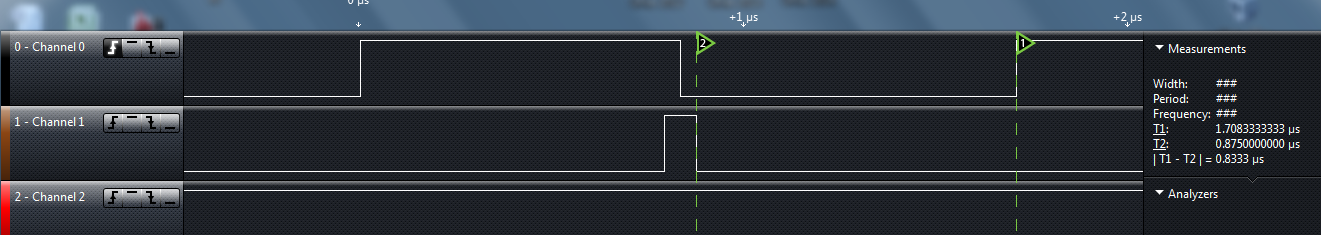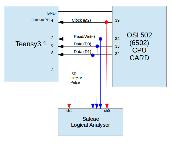 I ran two tests to better understand the latency on interrupts. The first was a semi-real-world test with the 6502s clock signal was connected to the Teensy interrupt pin. The 6502 clock would drive interrupts every 1 micro second. The second test was a loop back test where one pin on the Teensy was used to interrupted itself on another pin. I have a small Saleae logic analyser that could monitor these the input/output lines and record timings.