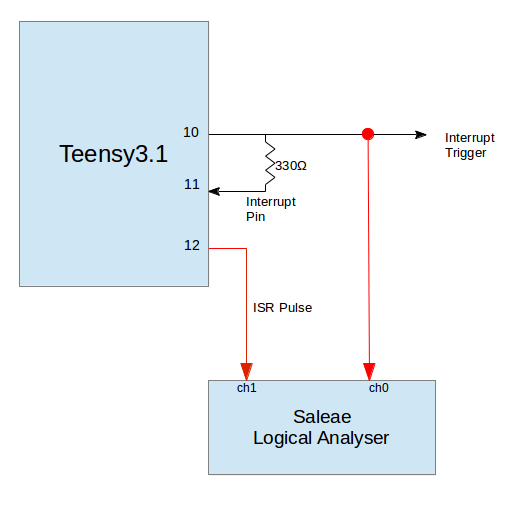 With this setup the main routine would bring pin 10 high to trigger and interrupt on pin 11. The ISR would bring the trigger pin low and pulse the output pin 12 on/off. Timing was recorded by the Logic Analyser.