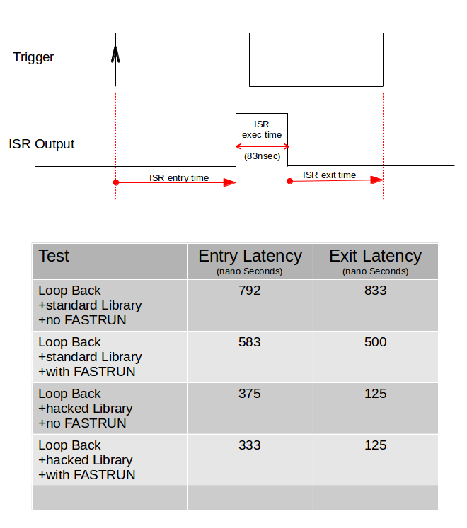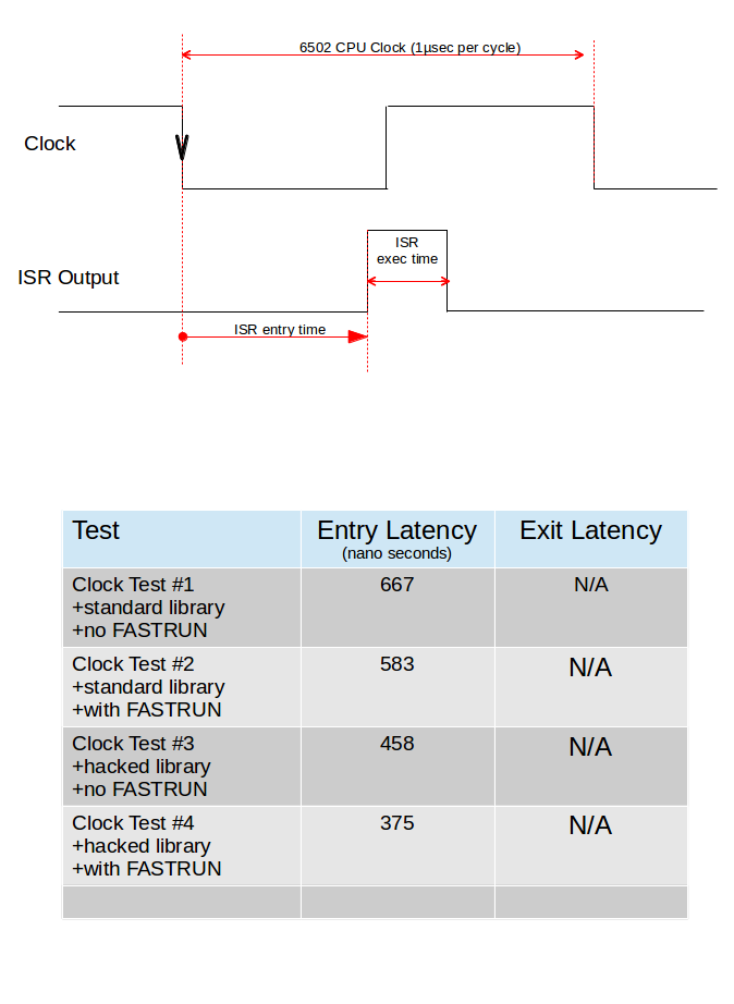 To make this approach work I needed to process interrupt on the Teensy at 1MHz. In addtion to the time needed to execute the Interrupt Service Routine (ISR), the time to enter and exit the ISR (interrupt latency) needed to be considered. When am interrupt occurs the ARM processor stores state, the Teensy core library interrupt handlers run and then the ISR starts to run.